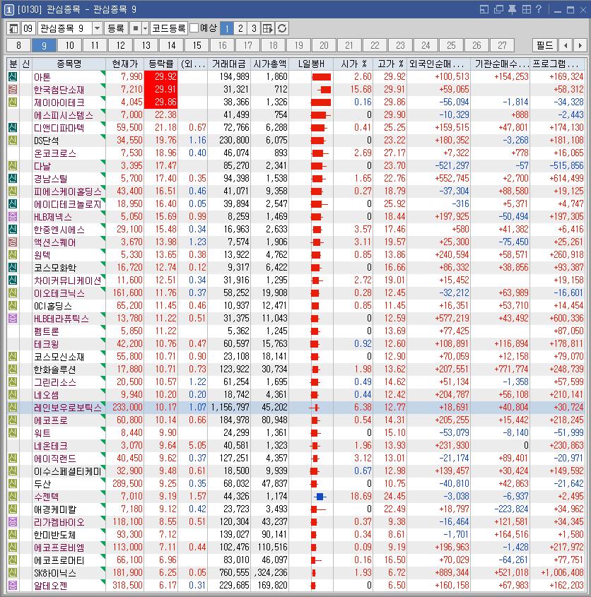 에스피시스템스 | 22.38 | 41,077 | 삼성전자의 레인보우로보틱스 자회사 편입 소식 지속 로봇 테마 강세 현대차·기아, 美서 전기차 보조금 받는다는 소식 속 2차전지 테마 강세 |