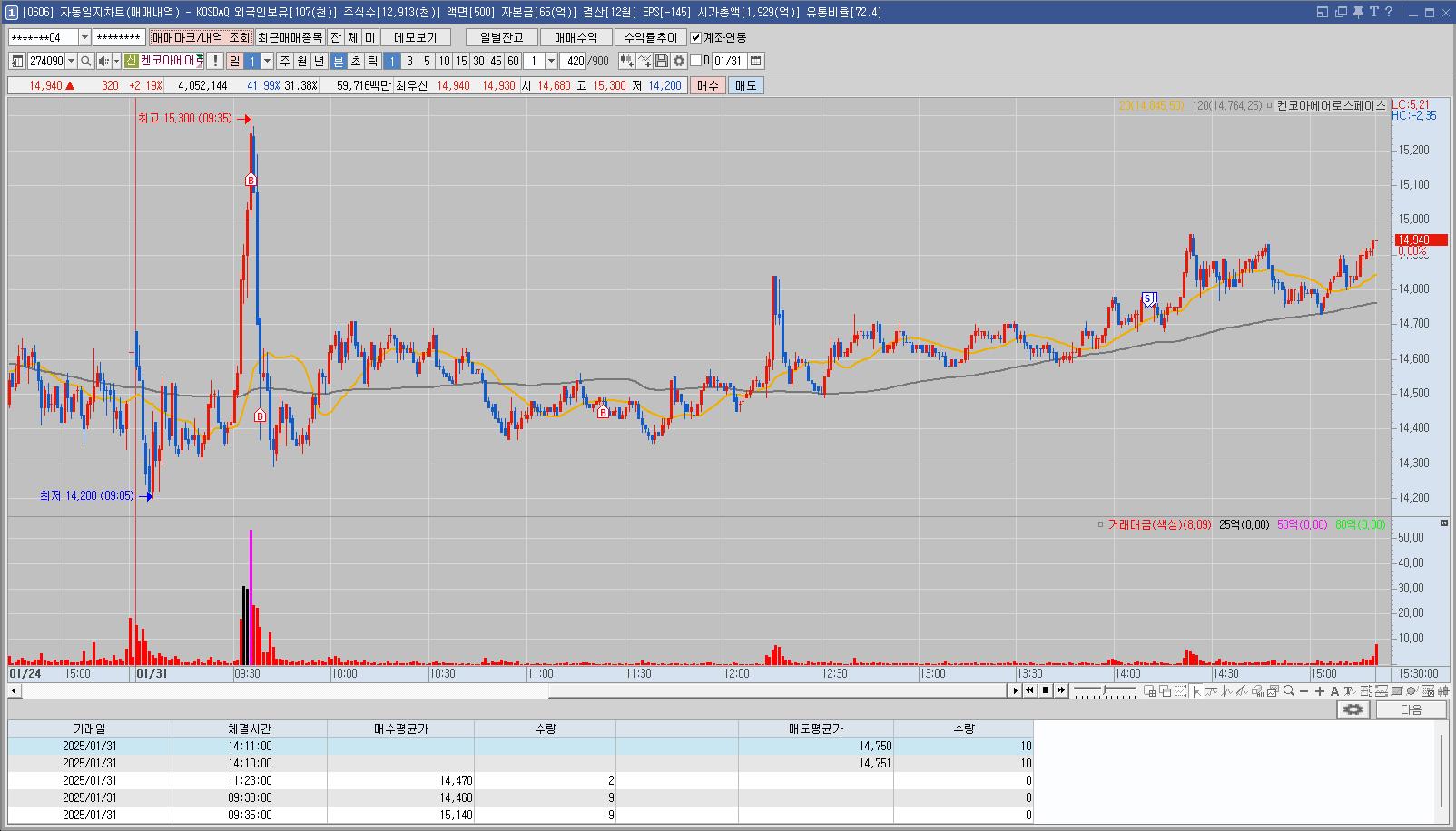 우주항공 관련주들이 대부분 반응이 없는 상태였기 때문에 좀 더 관망하는 것이 나았는데 고점에 덜컥 매수했다