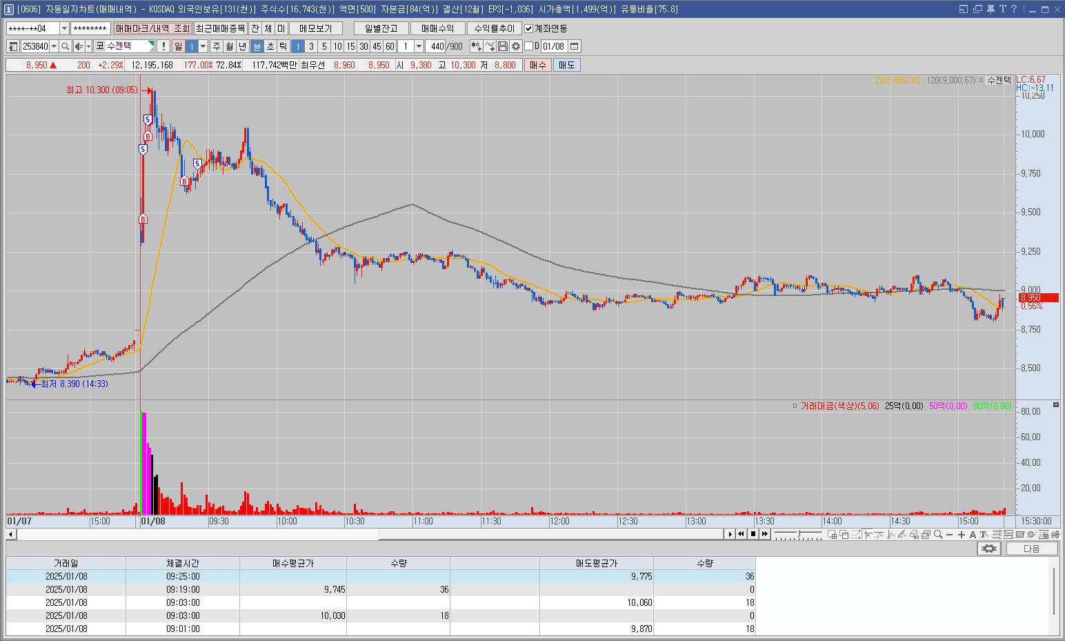 최근 재료가 겹치며 주목받는 종목. 일봉 위치가 애매해서 안하려고 했지만 장 초반 주목받는 모습에 지켜보던 중