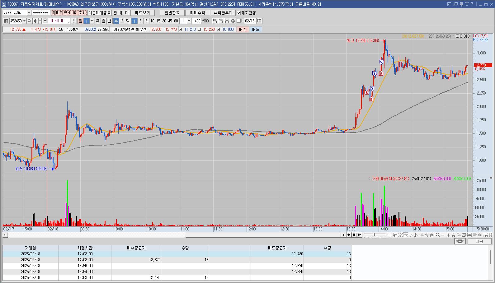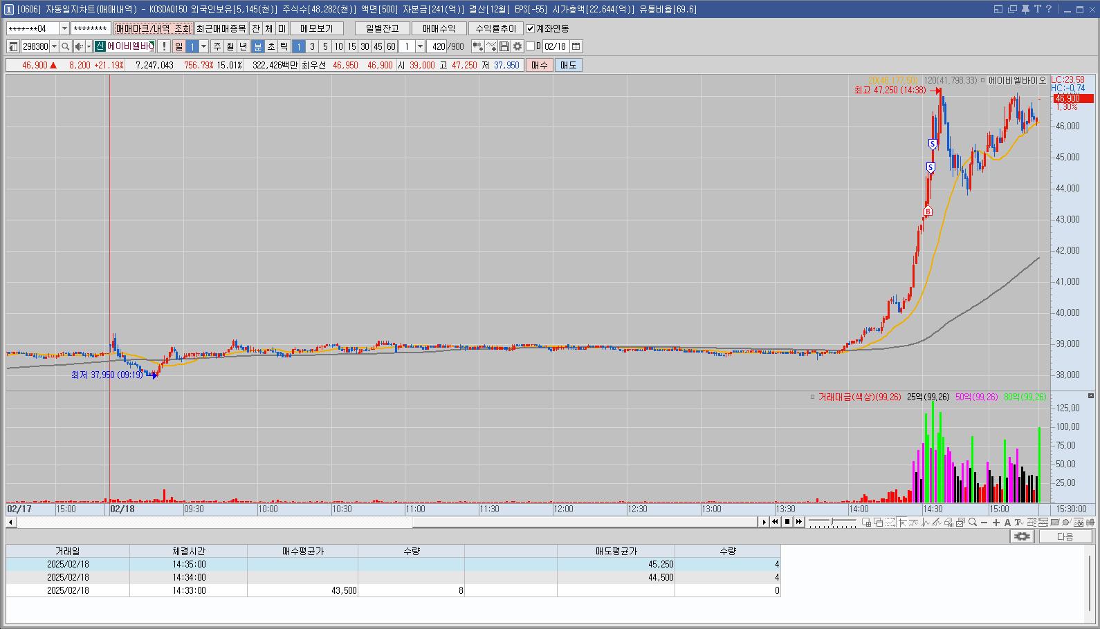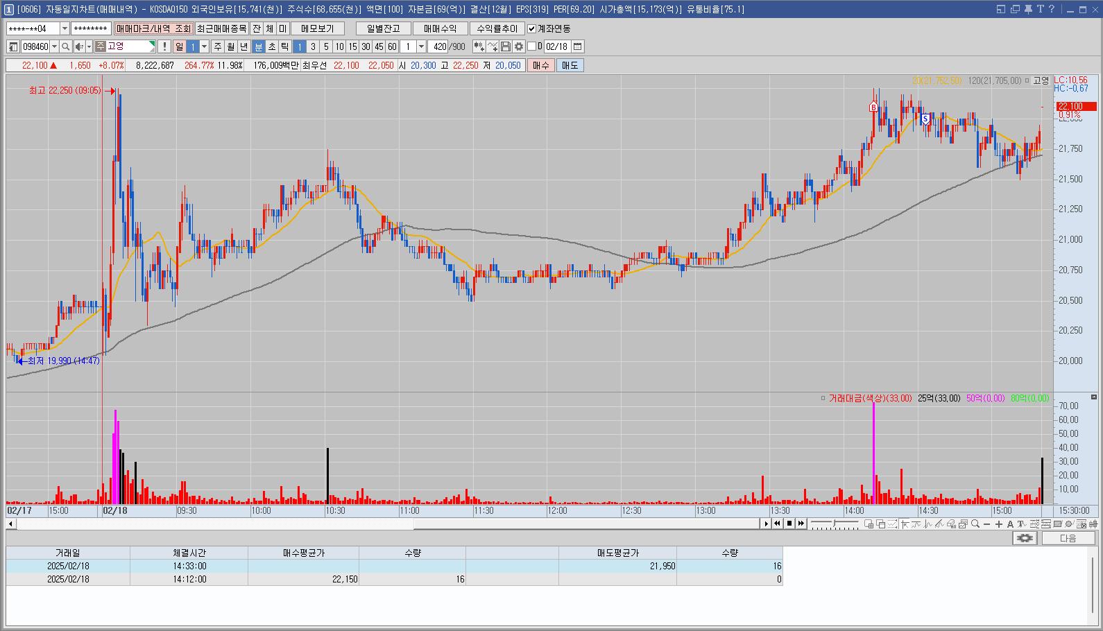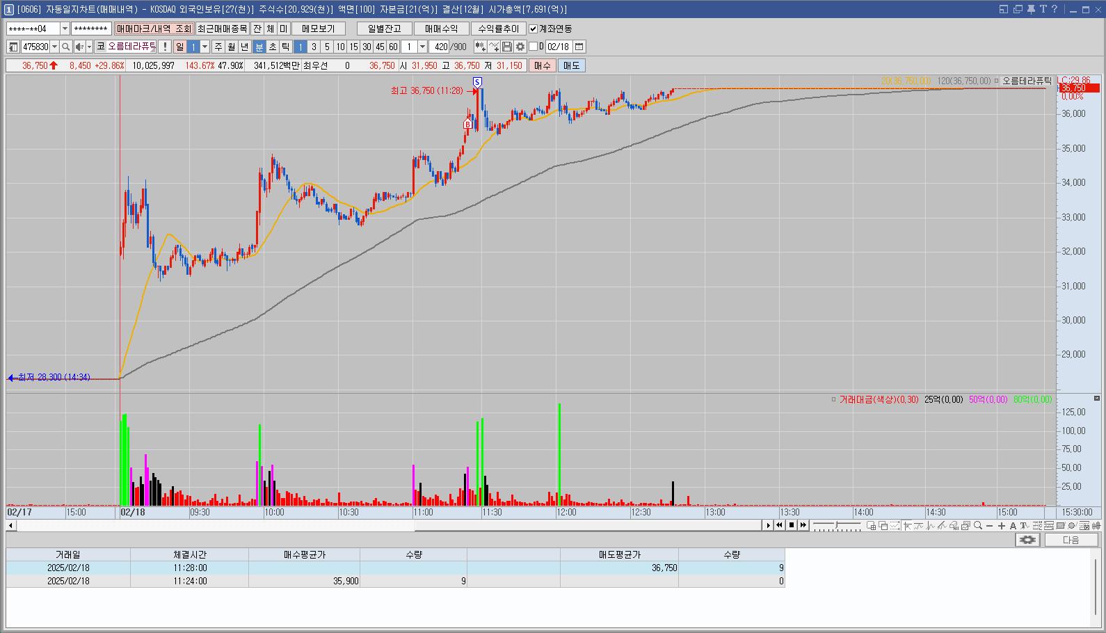 고영 매매중에 발견한 종목. 일봉상 돌파하고도 강하게 상승하는 것을 보고 고영을 손절 후 진입했는데 그래서 타이밍이 좀 늦었다