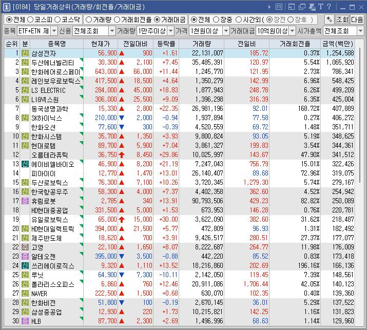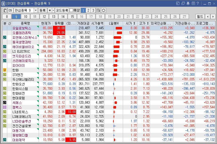 유일로보틱스 | 30.00 | 218,465 | K휴머노이드 로봇 연합 정부 주도로 출범 소식 속 로봇 테마 강세 실적 확대 기대감 |