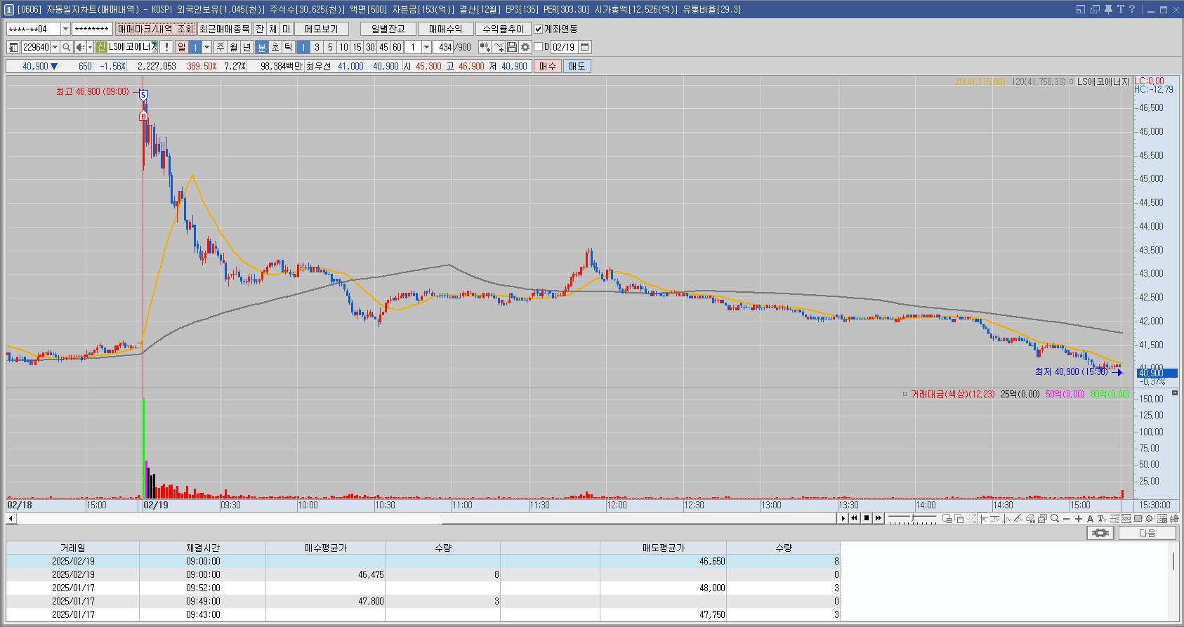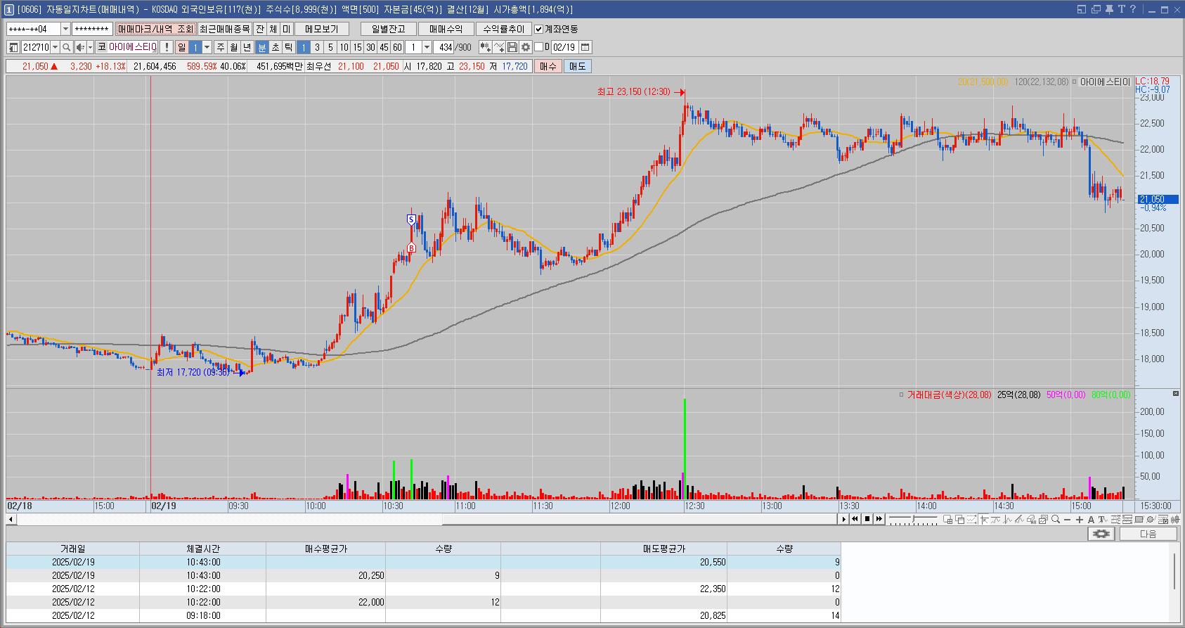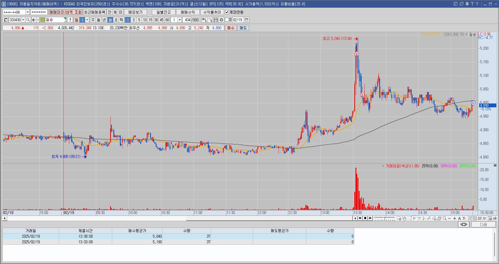 과거의 일봉 차트와 분봉 차트만 봤어도 매매를 안했을텐데 결국 잘 모르는 종목을 오른다고 무턱대고 산 뇌동매매의 결과이다
