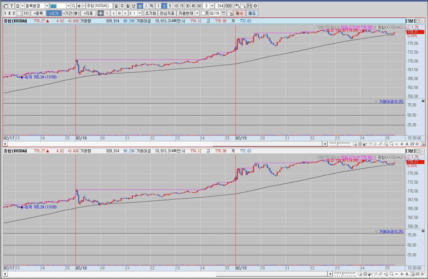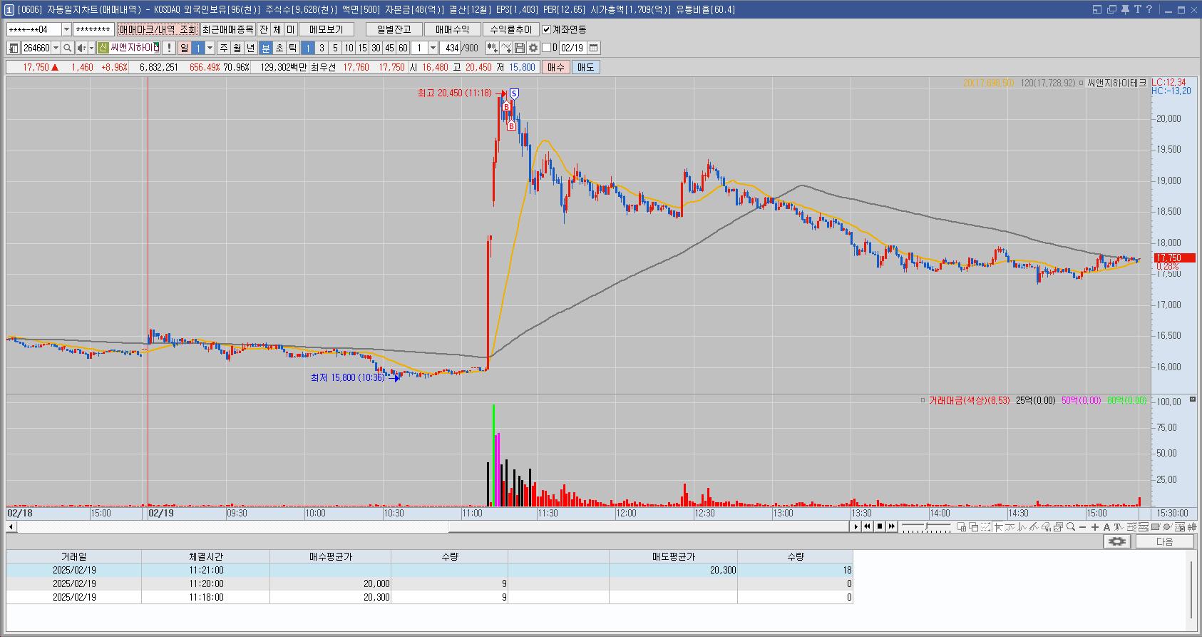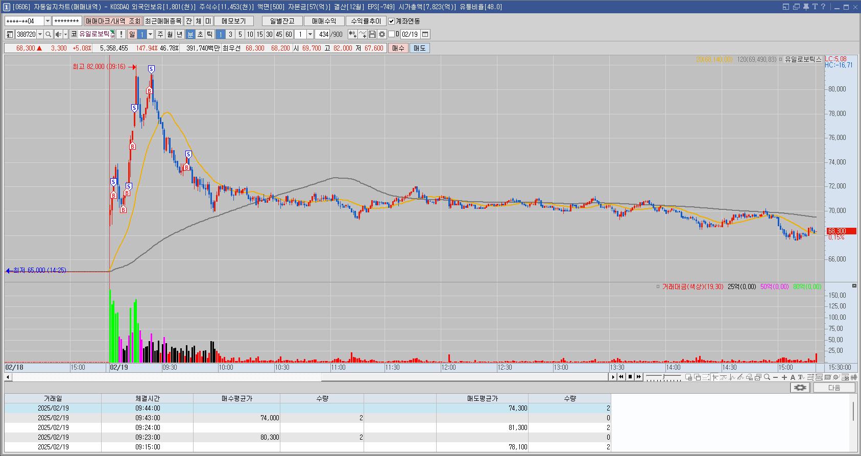 과거의 일봉 차트와 분봉 차트만 봤어도 매매를 안했을텐데 결국 잘 모르는 종목을 오른다고 무턱대고 산 뇌동매매의 결과이다