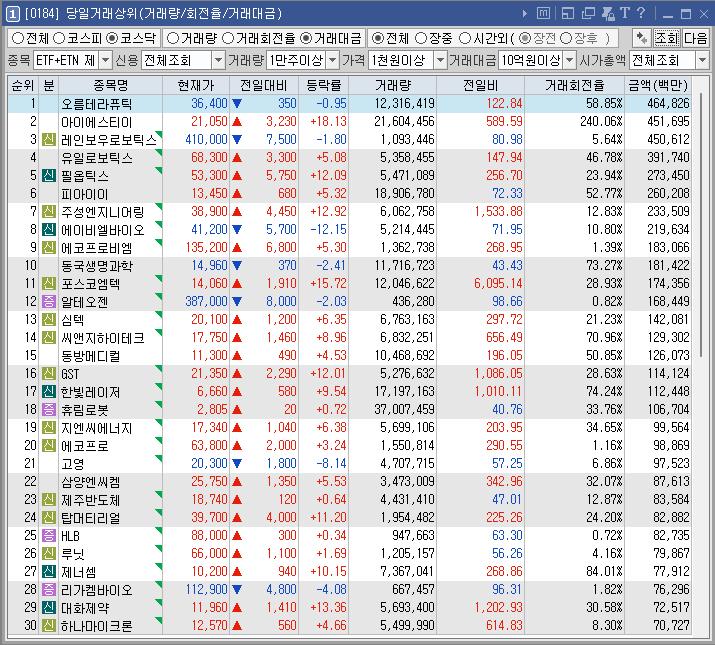 포스코엠텍 | 15.72 | 173,215 | 2차전지 시장 활성화 기대감 이스라엘 유니콘 스토어닷, 韓에 배터리공장 짓는다 소식, LG엔솔, 美서 GM대신 도요타에 전기차 배터리 공급 소식에 2차전지 테마 강세 |