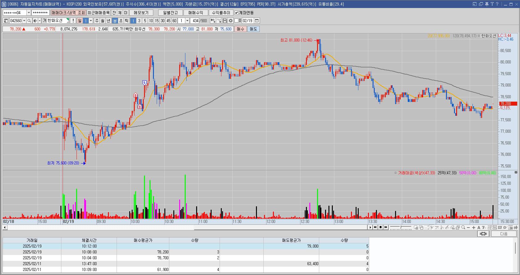 오후 시장도 보려고 HTS를 켰다가 조선주와 조선기자재 관련주들이 다 빨간불이 들어온 상태에서 갑자기 이 종목이 전고 돌파로 치고 올라가는 모습에 예전에 강했던 모습이 생각나 다른 조건들은 확인하지도 않은 채 눌림이라고 생각한 자리에서 매수를 했고 하락에 물타기를 했다. 반등에 팔려고 했는데 고점과 저점을 계속 하락시켰고 결국 종가까지 지켜보다가 종가에서 손절했다.