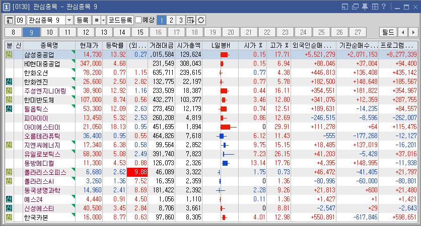 삼성중공업 | 13.92 | 1,008,169 | 美 LNG 수출 확대 허가 소식에 조선株 강세 |