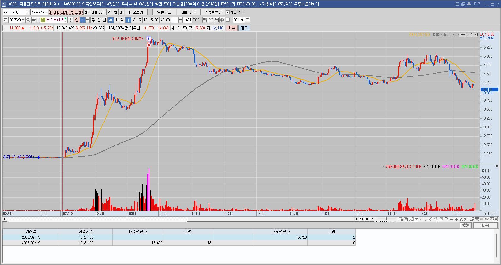 포스코DX가 상한가 들어가는 걸 확인하고 2등주인 이 종목을 매수했는데 이미 가파르게 많이 올라온 상태에 상승이 원활하지 않음을 느끼고 매도