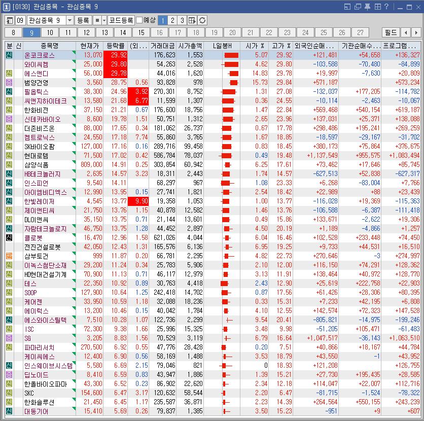 온코크로스 | 29.92 | 176,446 | 리커전 2상 발표 영향 AI 신약개발 플랫폼 기업들 강세 |