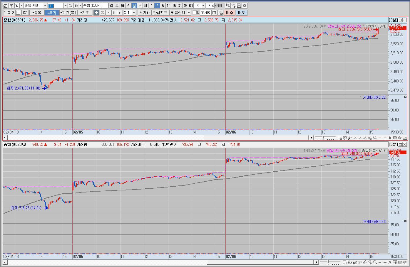 우리나라는 상승 출발해서 횡보하다 상승폭을 키우며 마감