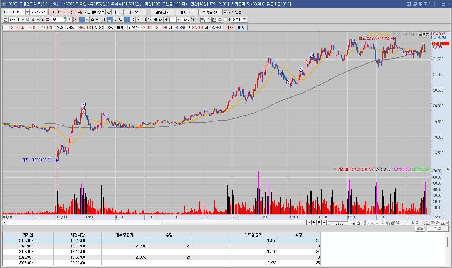 로봇주가 단체로 상승하고 있었고 그중 강한 종목인 클로봇을 매매