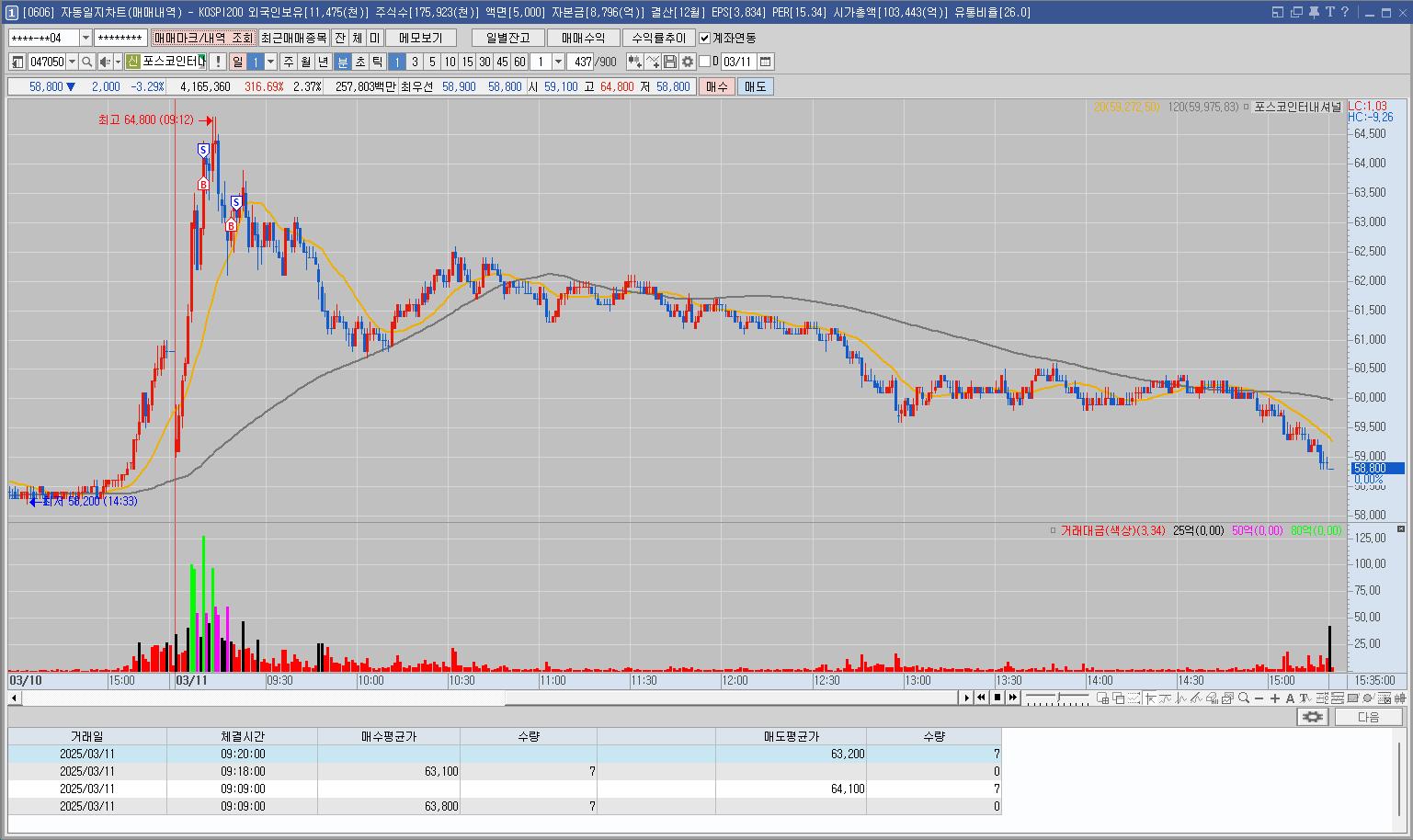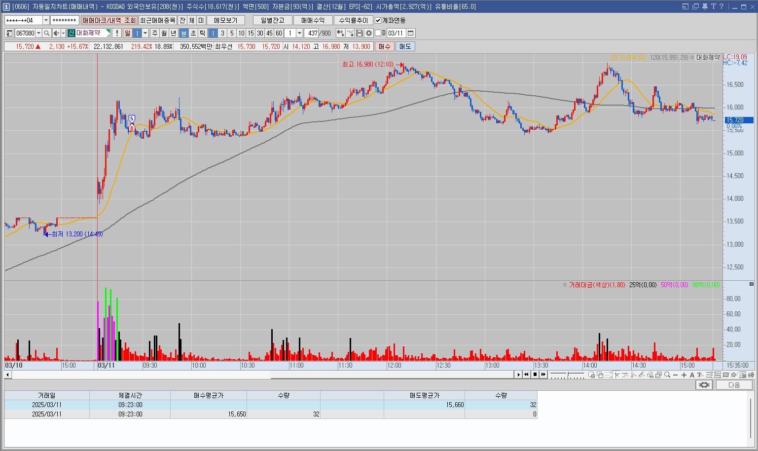 전일 상한가, 재료도 좋아보여서 지켜보던 중 눌림을 잡고 들어갔으나 움직임이 불안해서 매도