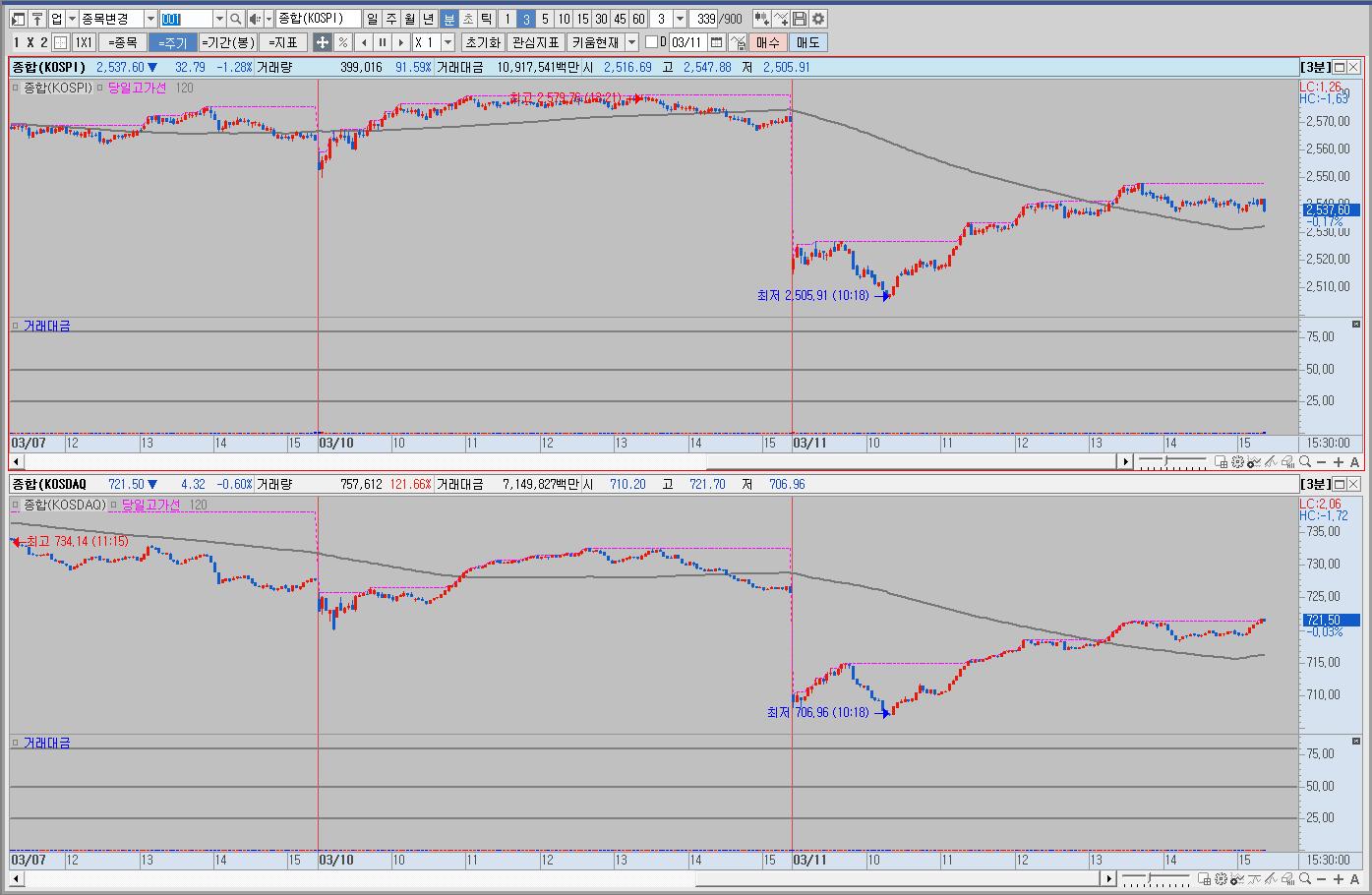 우리나라는 급락 출발해서 낙폭을 줄이고 점차 반등