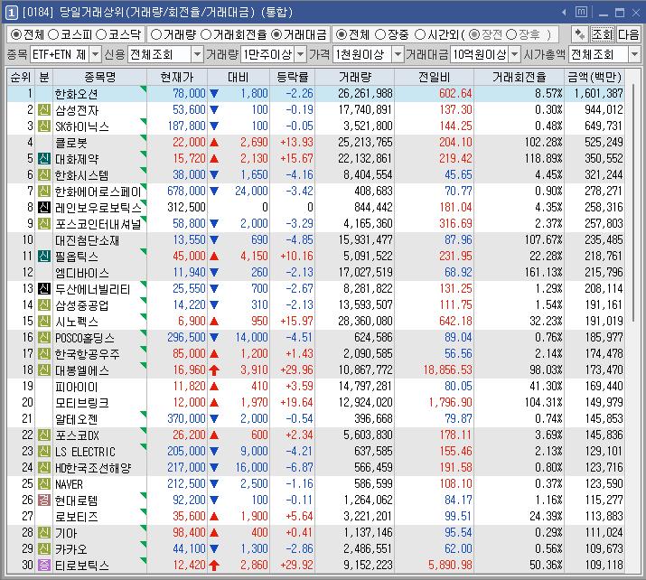 식량관련주를 제외하고 대부분 파랗게 시작해서 로봇관련주들이 전반적으로 상승했고 일부 신규주들도 강하게 움직였다