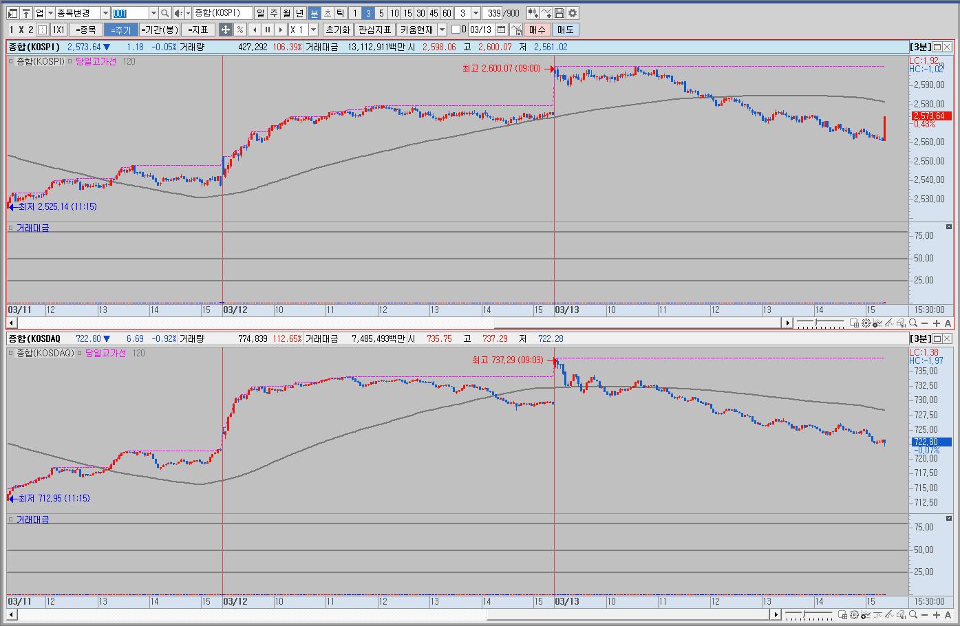 지표발표와 네마녀의날 등, 증시가 변동이 심하고 혼란한 분위기에서는 매매를 자제하거나 종목압축을 보다 더 신경써서 확실할 때에만 진입해야 하겠다