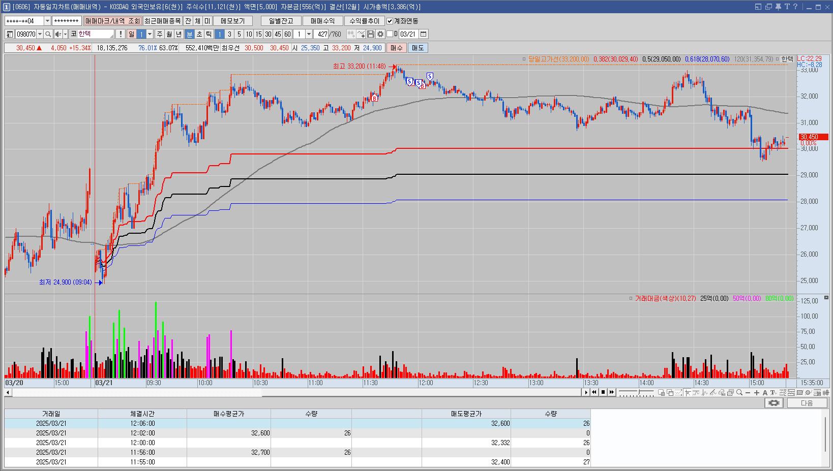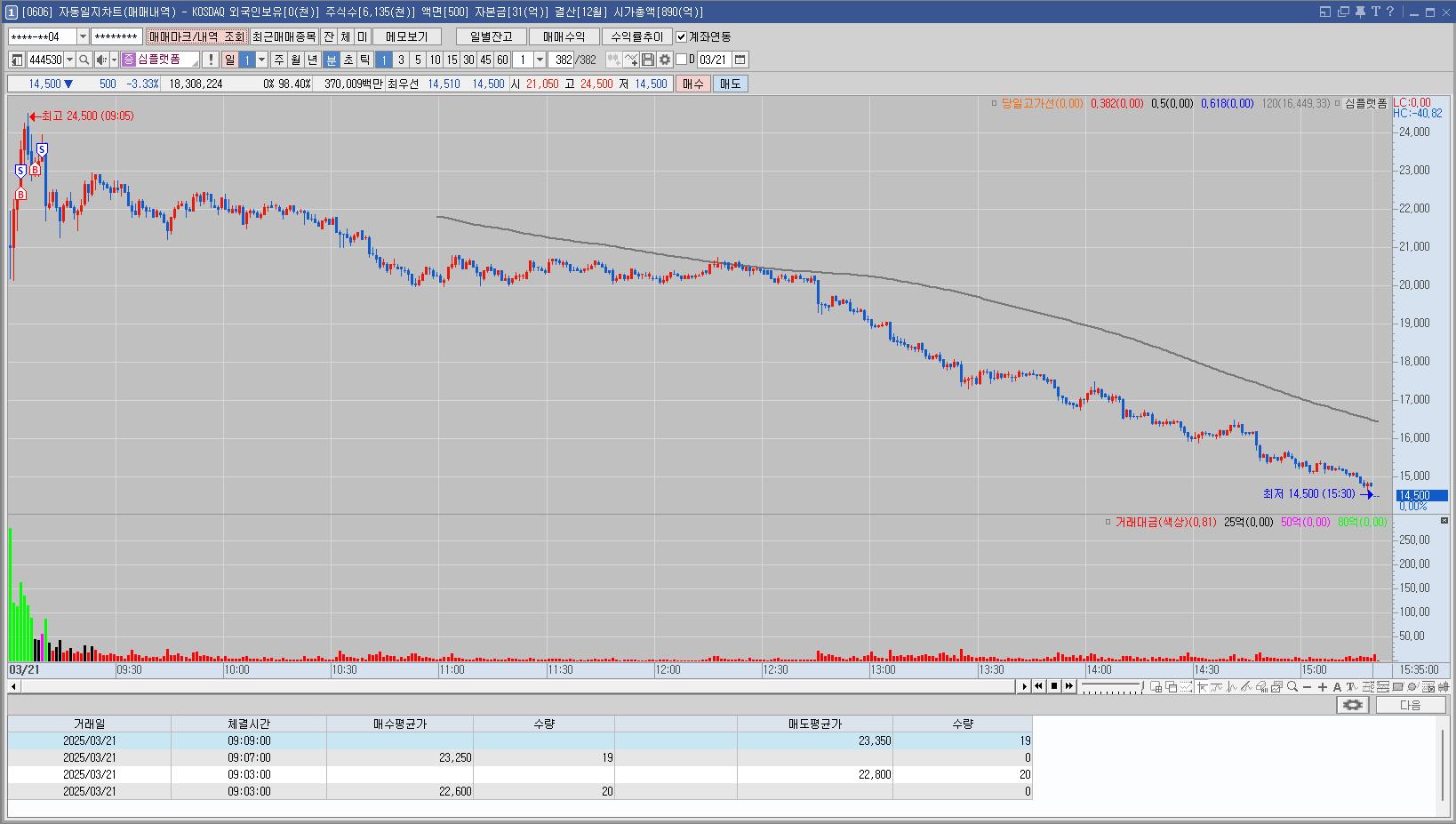 나중에 발견했을땐 다시 되돌리며 상승이 나오는 모습에 매수했고 이정도 힘이면 시장이 좋지 않아도 상한가 근처까지는 갈 것 같아서 버텨봤으나 하락하고 힘이 빠지는 모습에 매도