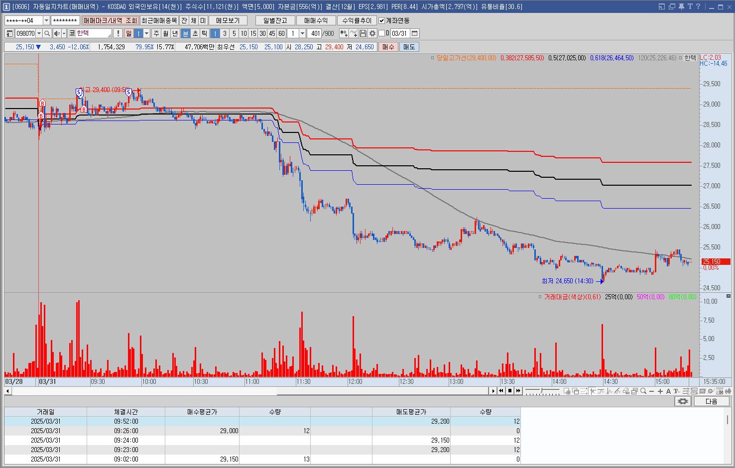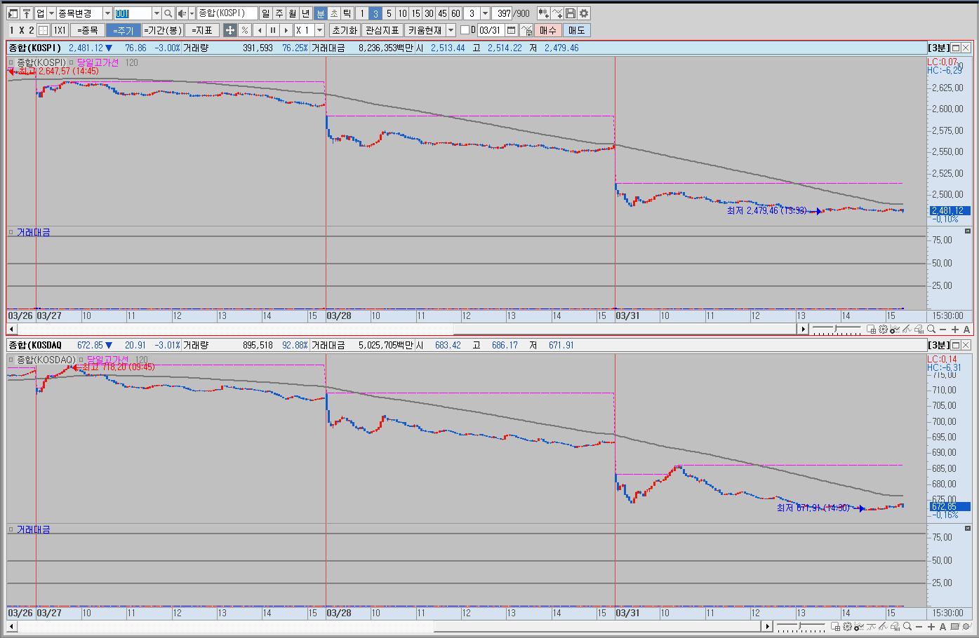 지수는 급격히 하락중인데 일봉상 되돌리고 상승하려는 모습과 분봉상 지지되며 버티는 모습에 매매