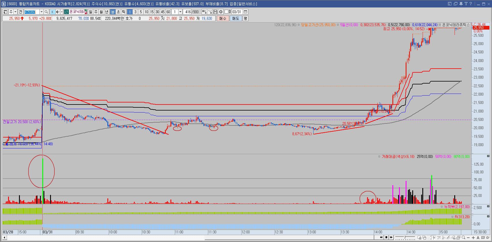 거래대금 동반 신 고점을 찍은 후 급락 - 반등 후 전 저점을 지키며 횡보 - 되돌리며 거래량 발생 - 모든 지지점 지표들 상단에 올림 - 호재뉴스 뜸