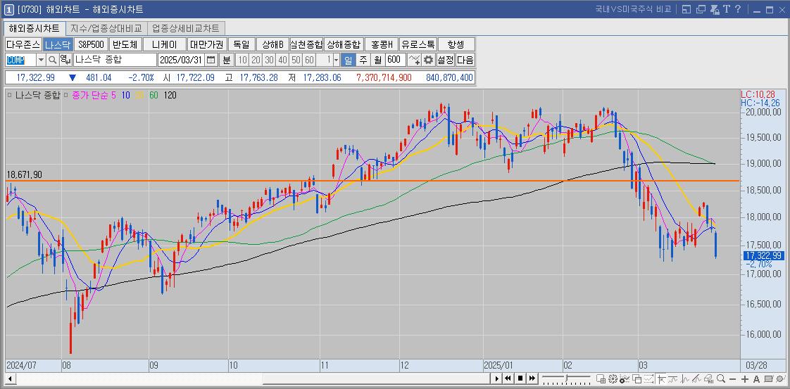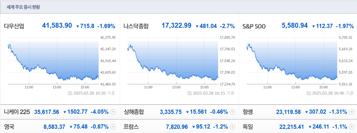 지난 주말 뉴욕증시는 트럼프 관세 정책 불확실성 지속 속 스태그플레이션 우려 등에 급락