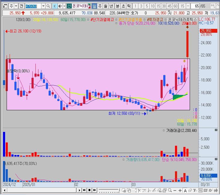 특히 온코닉테라퓨틱스는 큰 하락을 U자로 되돌리며 전고 돌파하고 상한가에 들어갔다