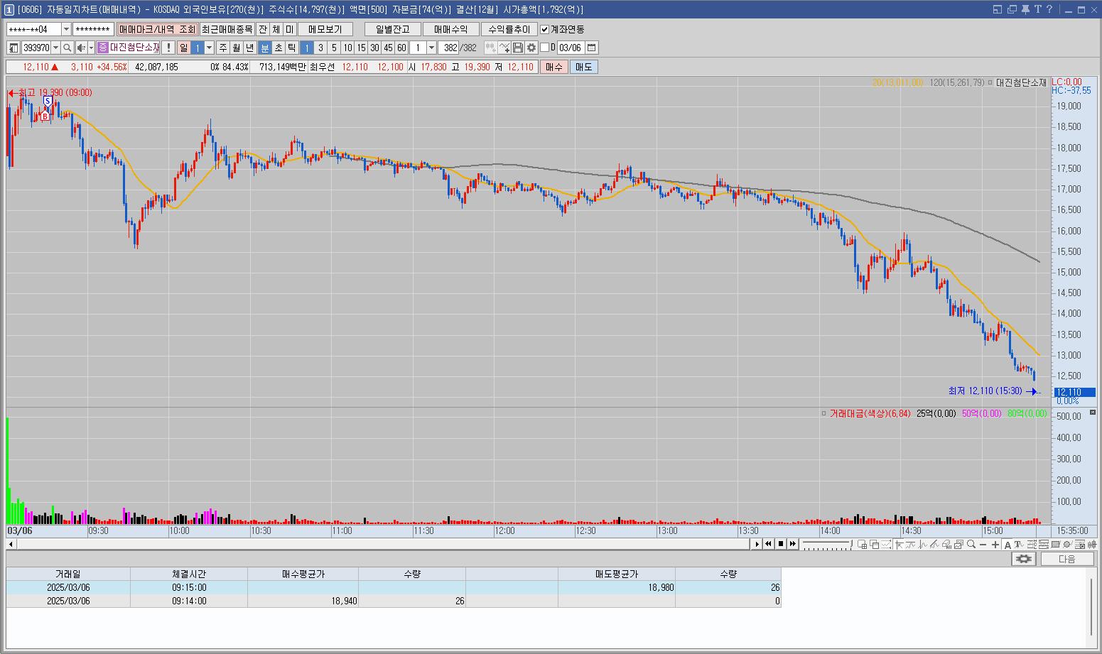 이 종목의 특성이 평소 오전에 상승시키고 하루종일 하락시키는 패턴이라 손절을 하려고 했지만 계속 횡보하면서 지켜주는 모습에 조금만 올라오면 손절하자는 생각으로 버텨보았고 시간이 한참 흐른 후 반등에 손절