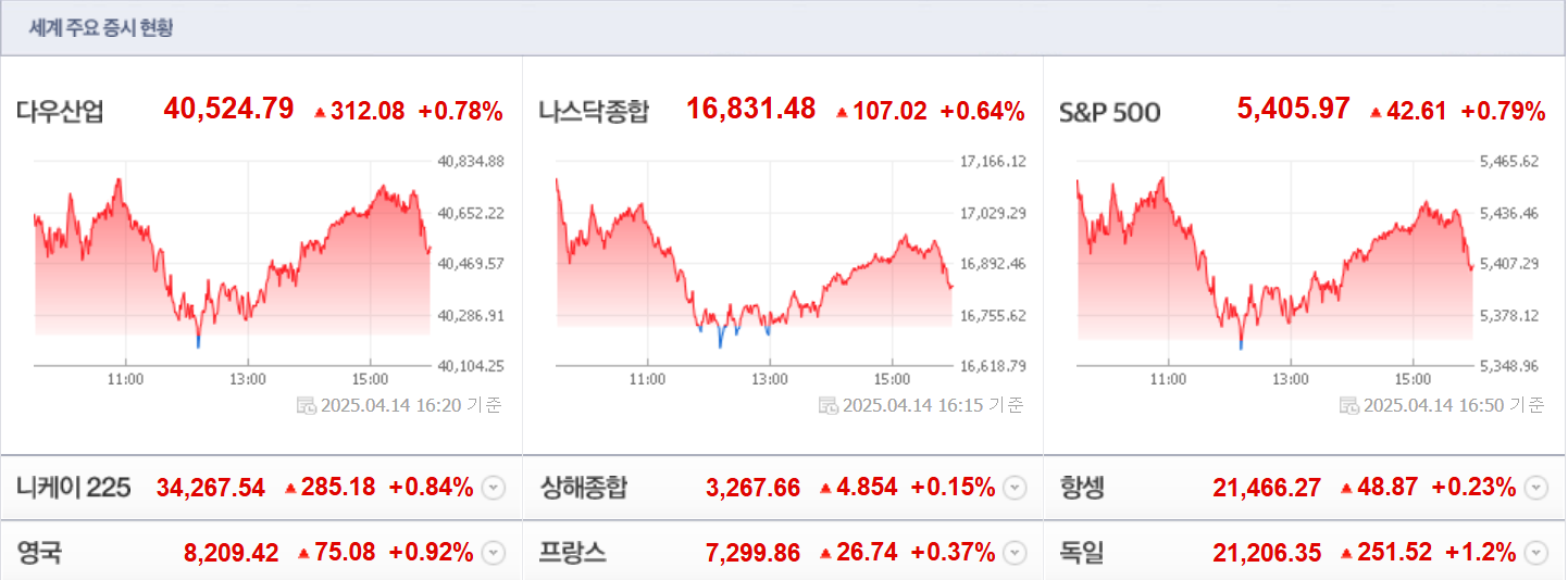 지난밤 뉴욕증시는 트럼프 관세정책 완화 기대감 등에 상승