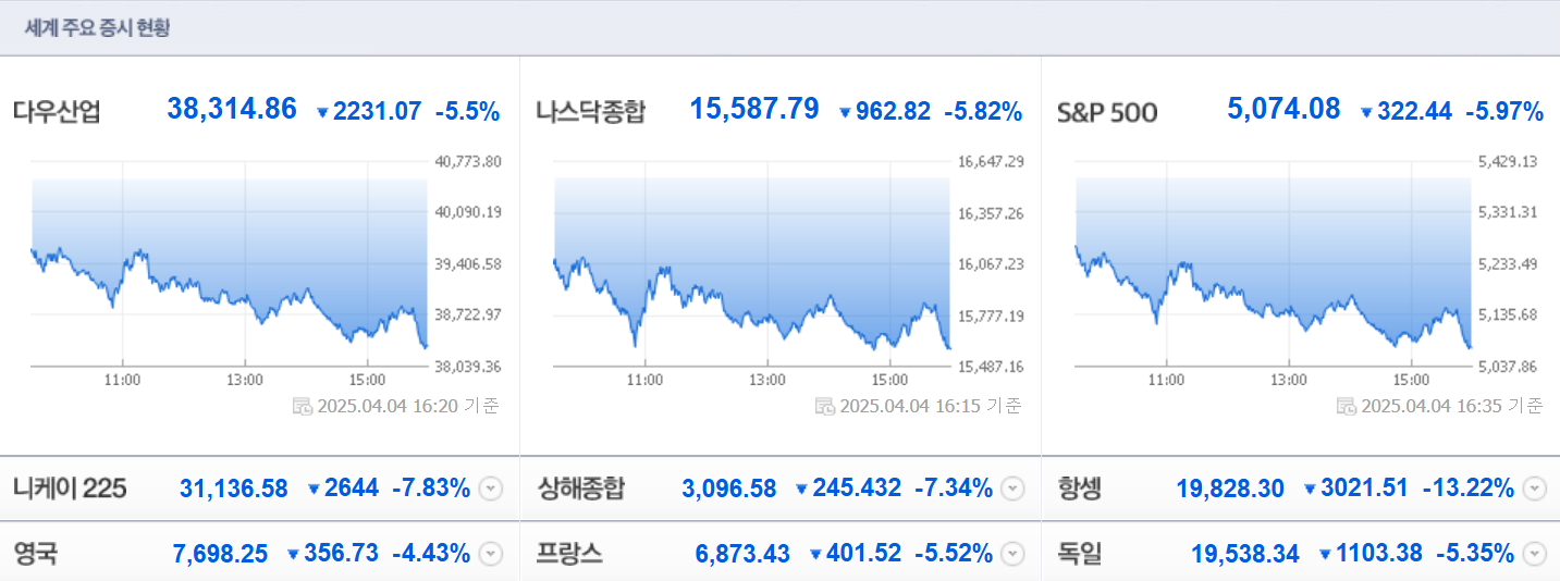 주말 뉴욕증시가 트럼프 상호관세 쇼크 지속, 파월 의장 매파적 발언 등에 폭락세