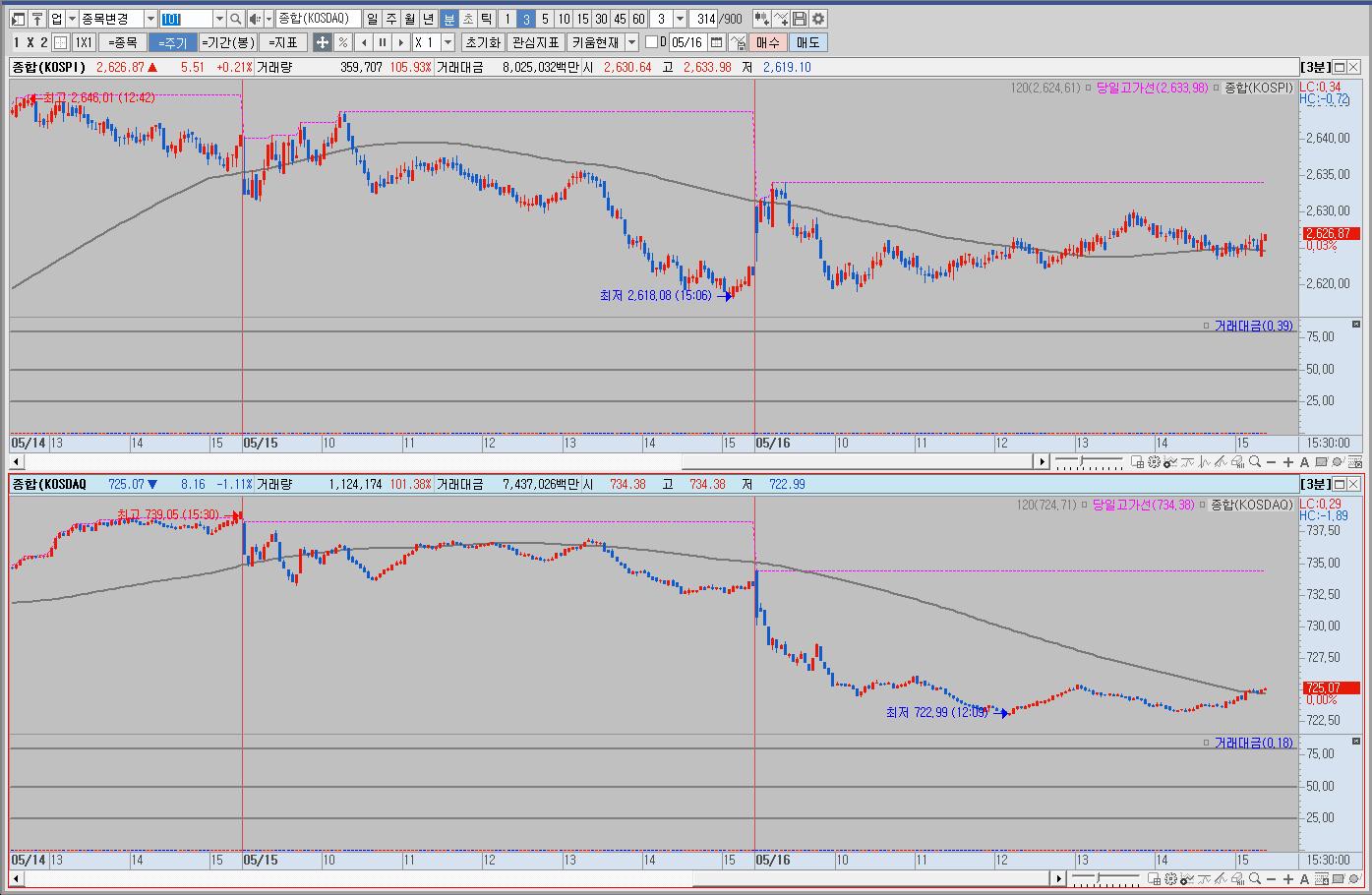 우리나라는 상승 출발해서 하락후 등락