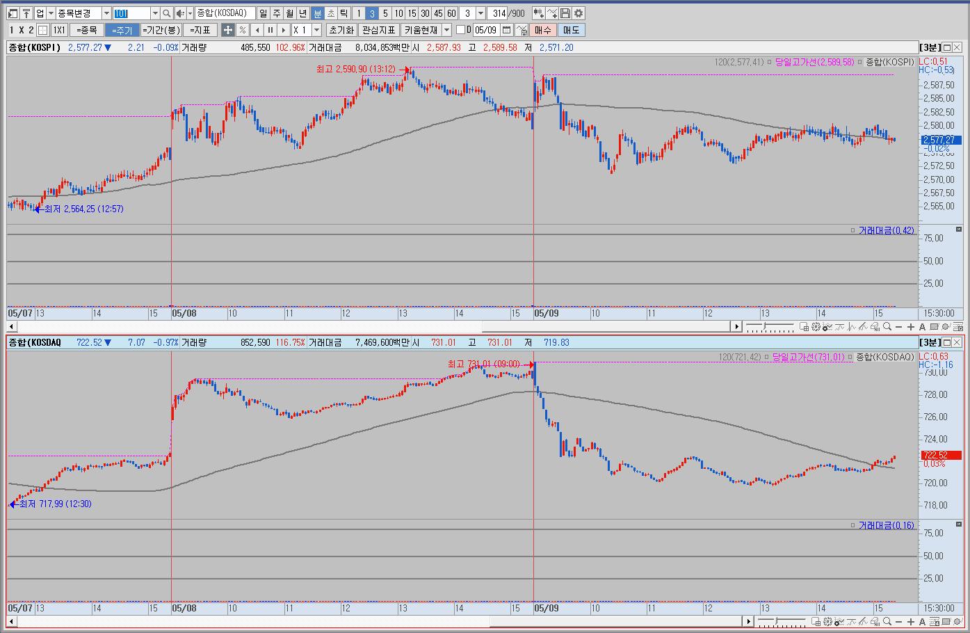 우리나라는 상승출발해서 하락후 등락