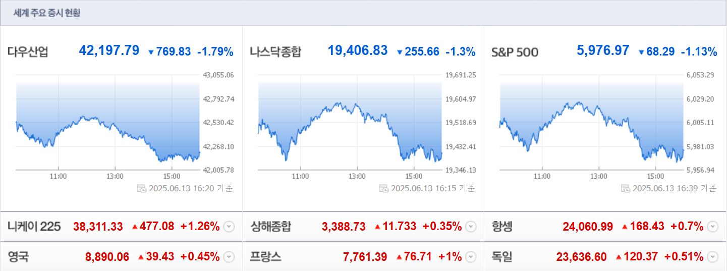 주말 뉴욕증시는 이스라엘 이란 갈등 고조 등에 하락
