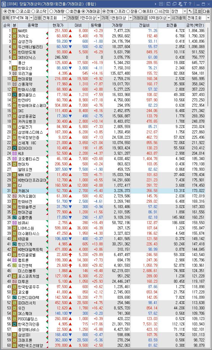 카카오 9.42 1,770,817 원화 스테이블코인 제도화 기대감 속 핀테크 테마 강세