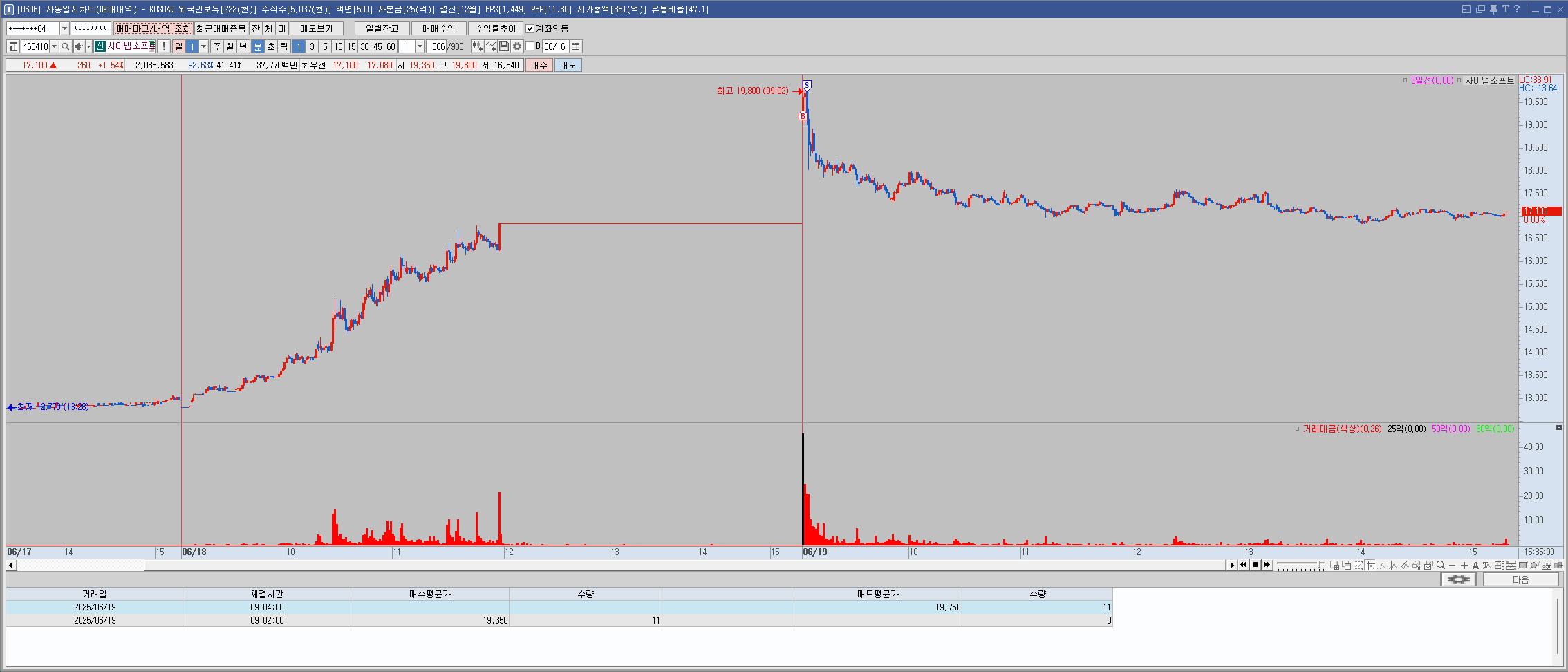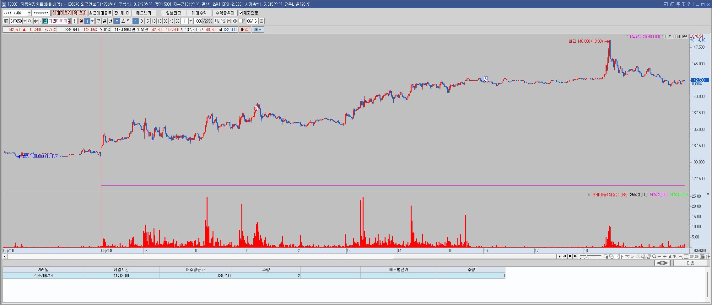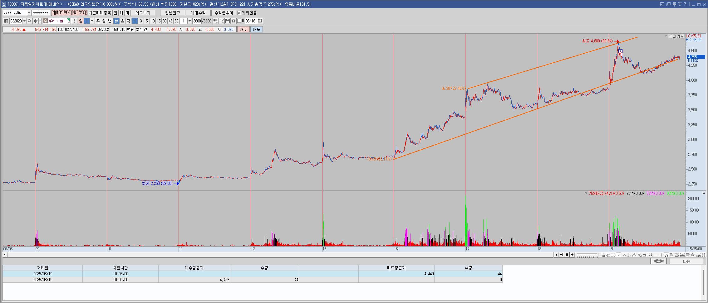 어제 장 초반에 못봐서 매매를 못한것이 아쉬워서 오늘도 상승하기에 못참고 뇌동매수했으나 역시 바로 고점. 손절