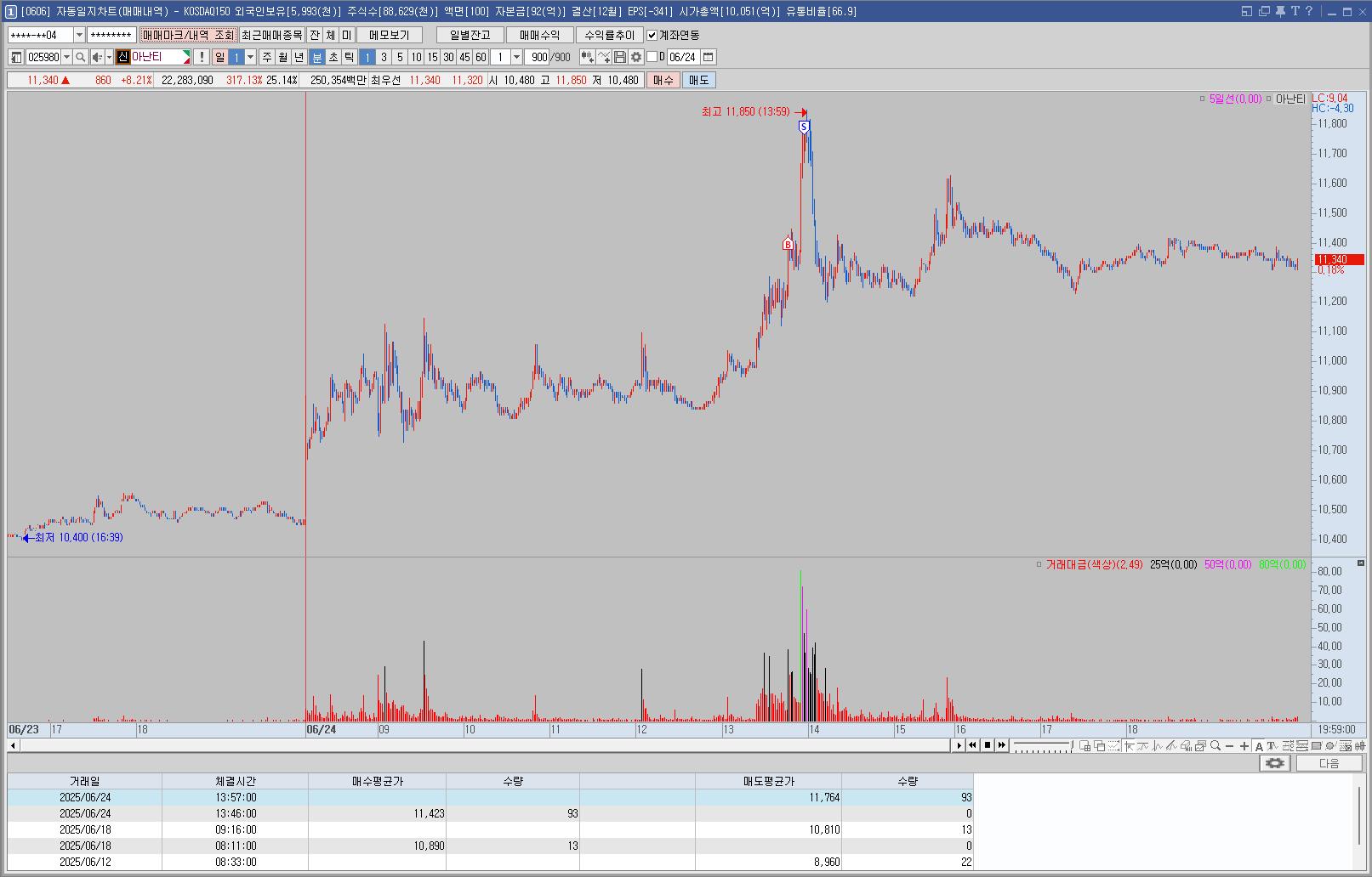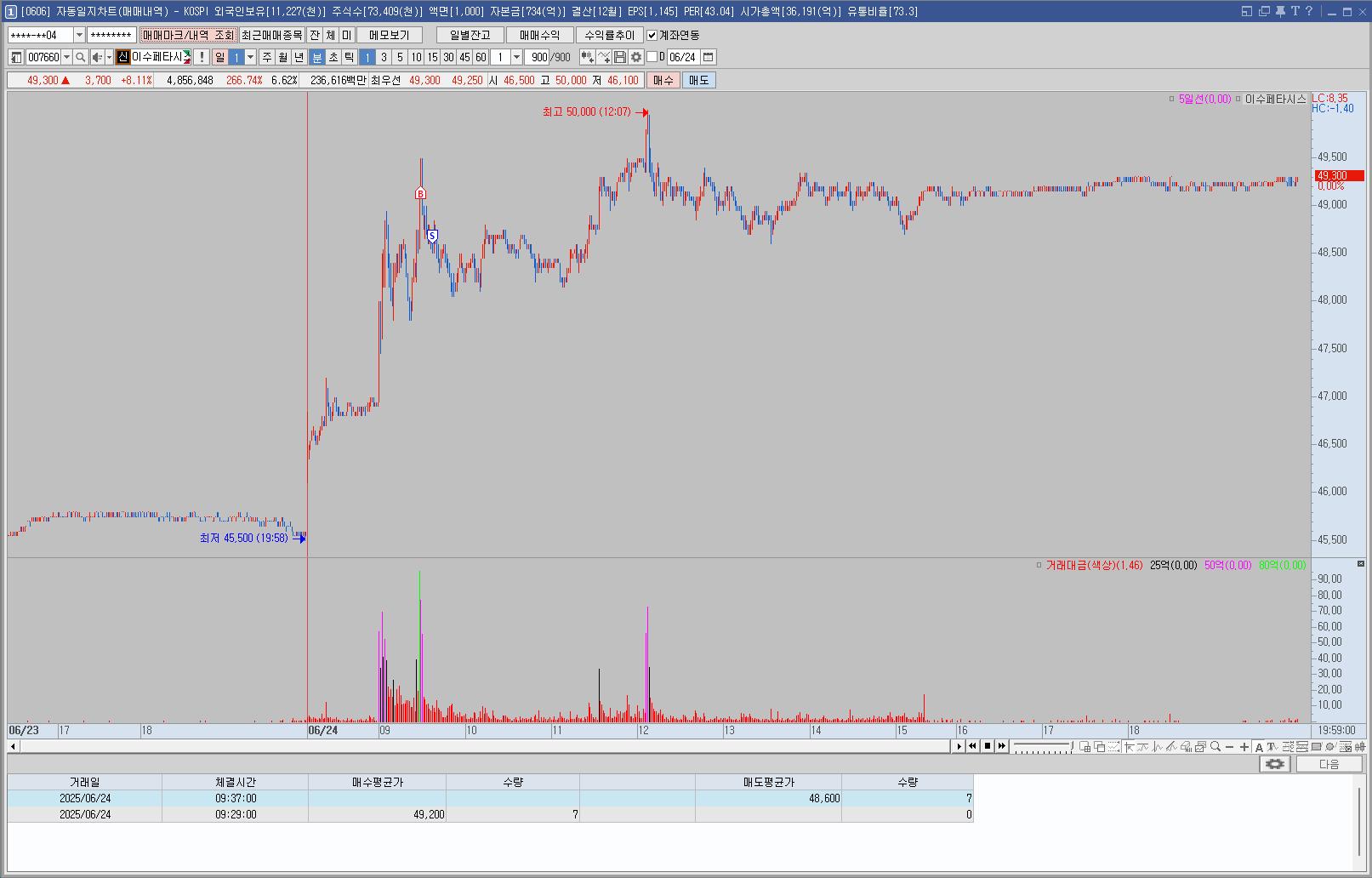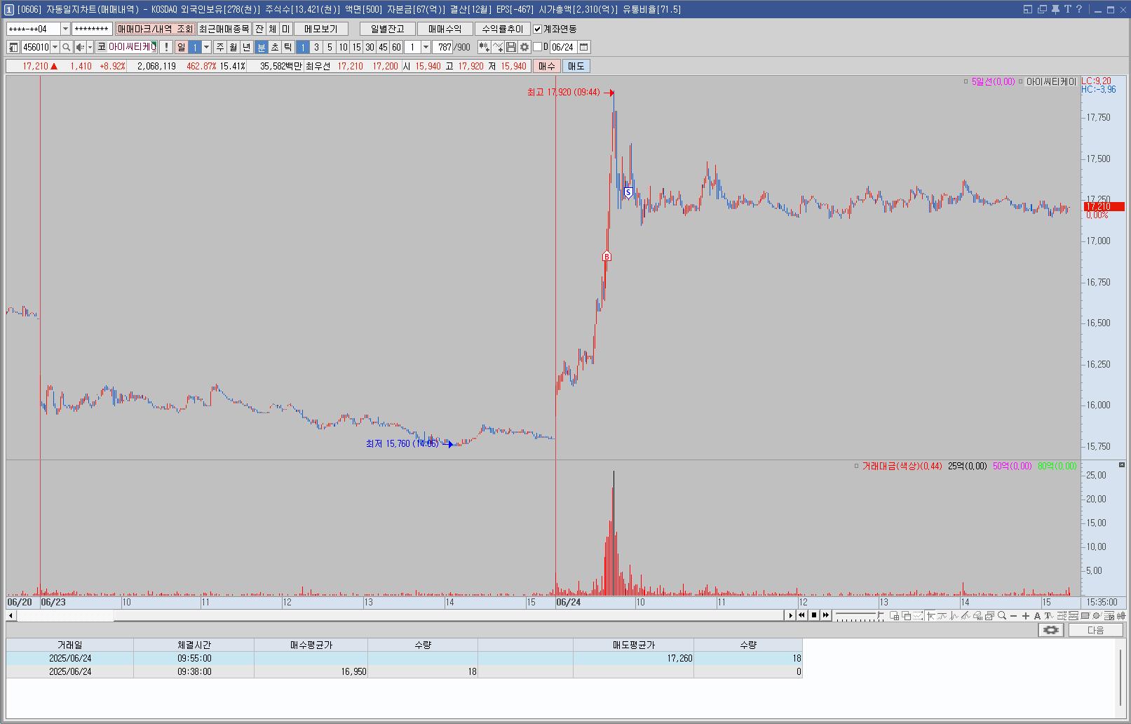 북한 교류 관련 뉴스가 종종 나오고 대북주가 상승세인 상황에 일봉상 한번 부각될 것 같아서 보고 있던차에 상승흐름이 나와서 매매했는데 너무 가파르게 슈팅이 나와서 매도