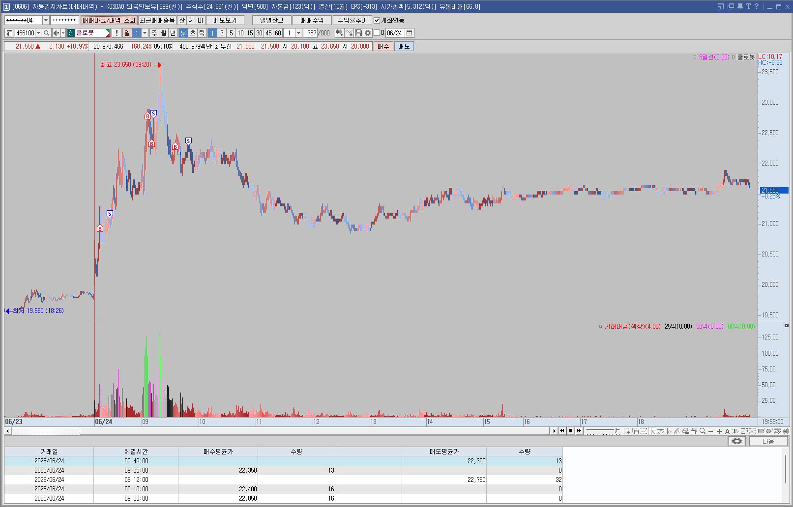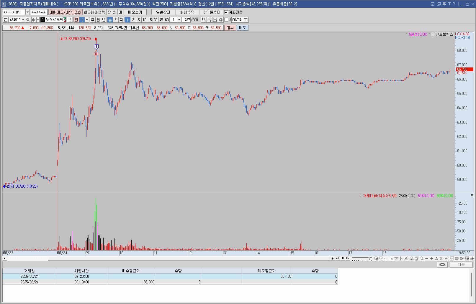 어제 로봇관련주들이 강했었고 오늘 초반에 영향을 줄 것 같아서 지켜보던 중 거래대금 붙으며 상승하는 종목은 이 종목이어서 매매를 했는데 생각보다 약한 흐름에 매매가 어려웠다