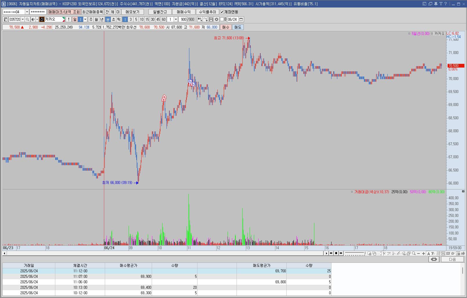 이미 많이 상승하고 조정이 나올 것 같았는데 저점 찍고 상승흐름이 나오는 모습에 매수했는데 흐름이 7만 뚫어놓는게 목적인 것 같아보였고 7만 근처에서 엄청난 물량을 쏟아내는 것이 하루종일 물량 정리할 것이라 생각하고 매도