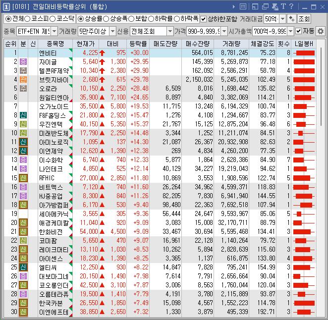 텔콘RF제약 | 29.90 | 25,639 | 계열사 에이비온, 1.8조 항체신약 기술수출 소식 지속 |