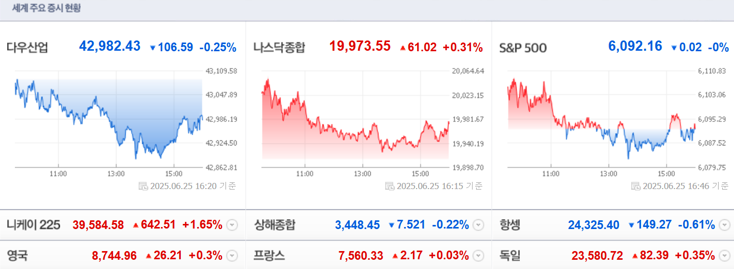뉴욕증시는 이스라엘-이란 휴전 상황 주시, 파월 Fed의장의 발언이 좀 더 비둘기파적 입장으로 해석에 혼조세
