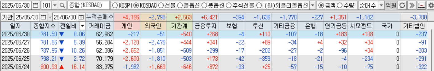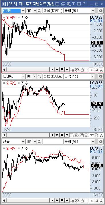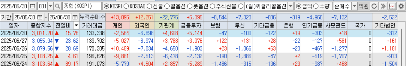 기관과 개인의 동반 순매수, 외국인은 4거래일 연속 순매도하며 코스피 지수 상승폭을 제한