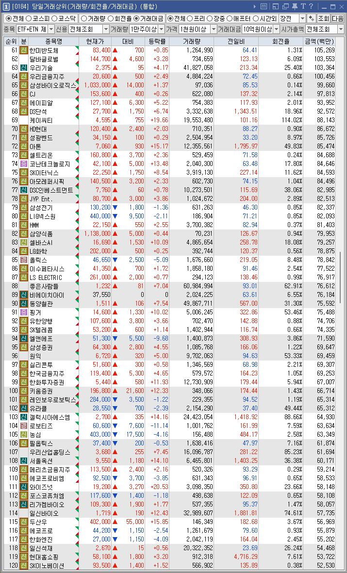 종목명 | 등락률 | 거래대금(백만) | 이유 |