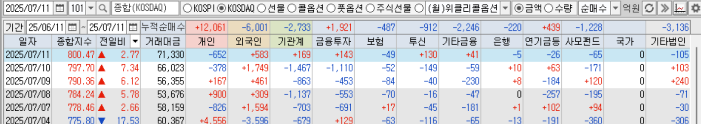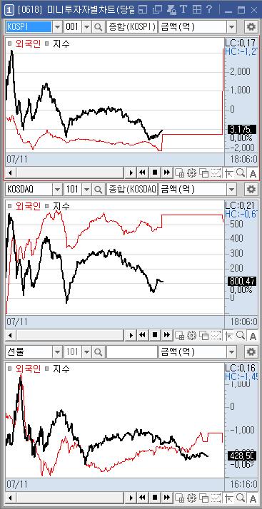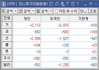 기관이 순매도하며 지수 하락을 이끌었고 외국인은 초반에 매도하다가 후반부에 기관의 물량을 많이 받은듯