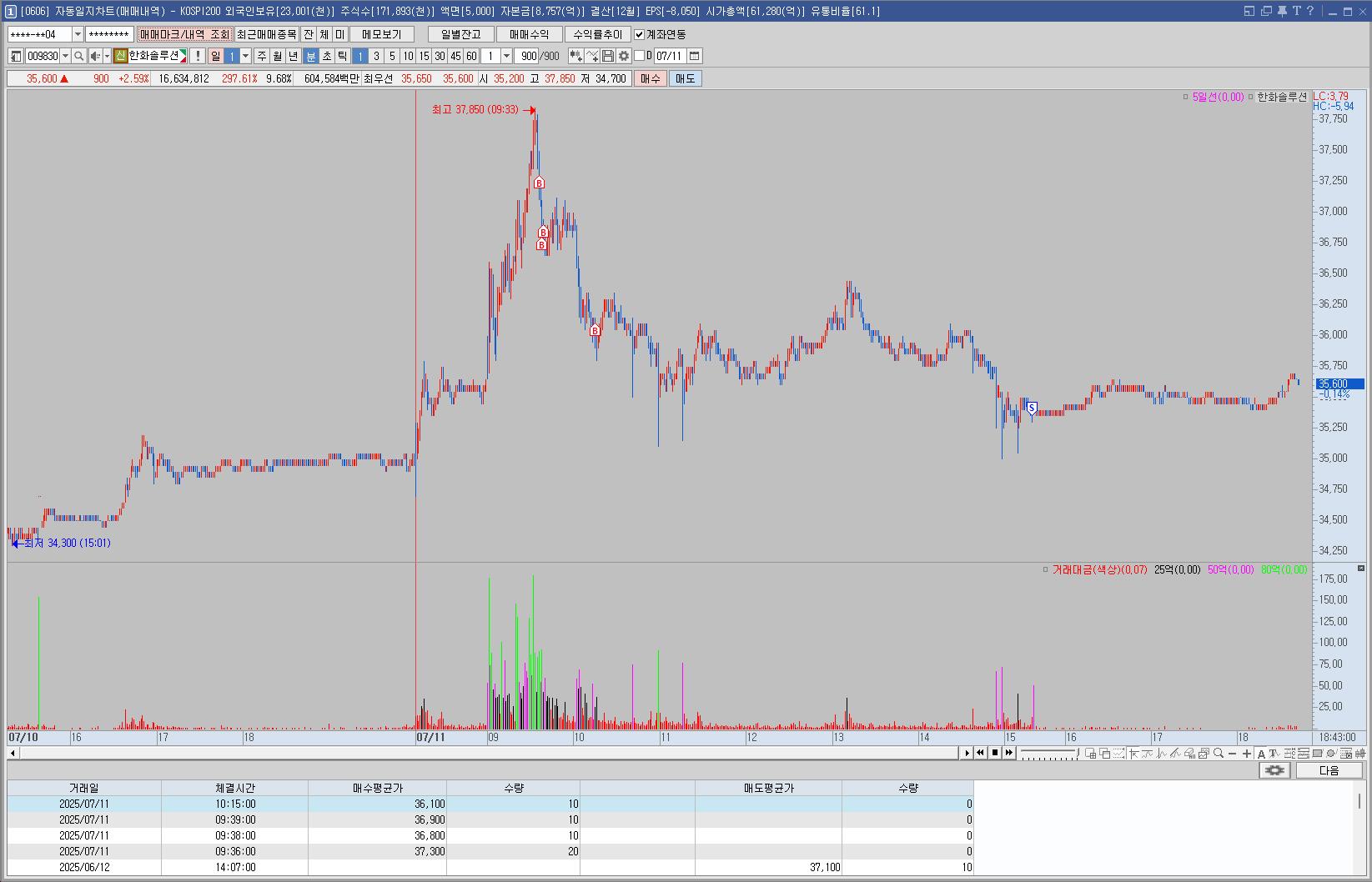 수익을 냈고 금요일인데다 지수 신고가에 불안정함을 느꼈으면 좀 더 관망해도 되었을텐데 정부 정책인 RE100 산단 관련 호재 뉴스와 한화솔루션 목표주가 상향 리포트에 마침 한화솔루션 차트는 매물대 돌파를 위해 매물 소화 막바지인 차트라는 생각에 관심을 갖고 있었는데 장 초반 매우 강한 매수세로 상승시키는데 조정도 잘 없이 올리는 모습에 욕심에 조정다운 조정이 오지 않았는데도 매수를 해버렸고 강하게 갈 것 같은 확신에 비중을 일찍 더 태웠고 이정도 돈이 들어왔으면 눌렸다가 갈 것이라는 믿음에 손절이 나가지 않았고 버티게 되었다