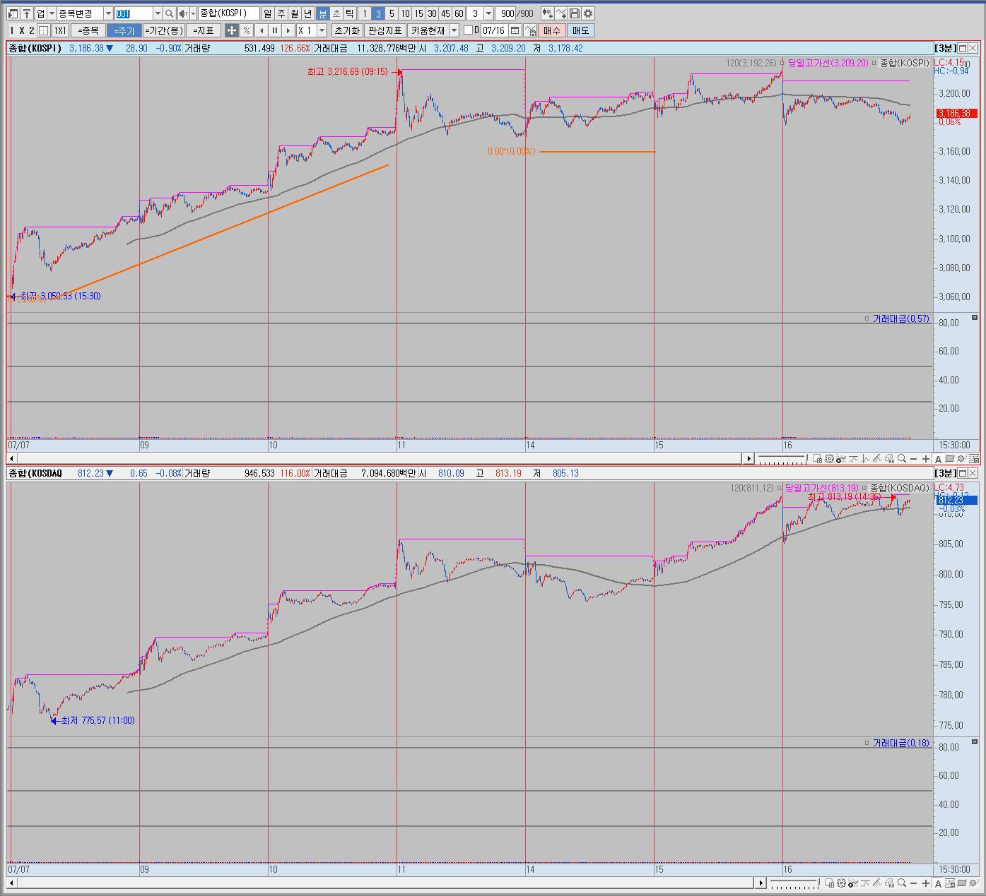 우리나라는 하락 출발해서 급락했고 이후 등락하며 횡보