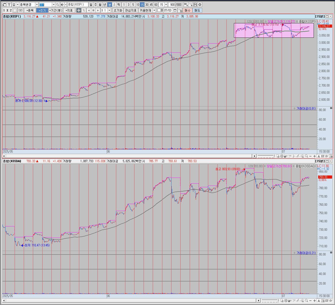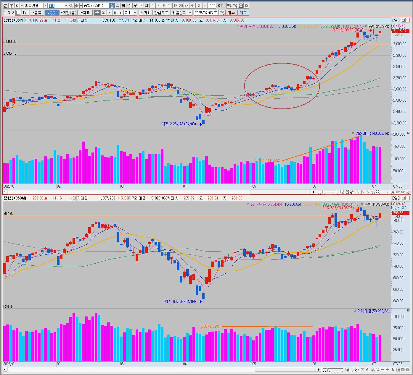 외국인과 기관의 동반 순매수. 美-베트남 무역 합의 타결 소식. 트럼프의 세액공제 관련법이 상원 통과하며 반도체관련주 수혜.오늘 상법 개정안이 국회 본회의를 통과.